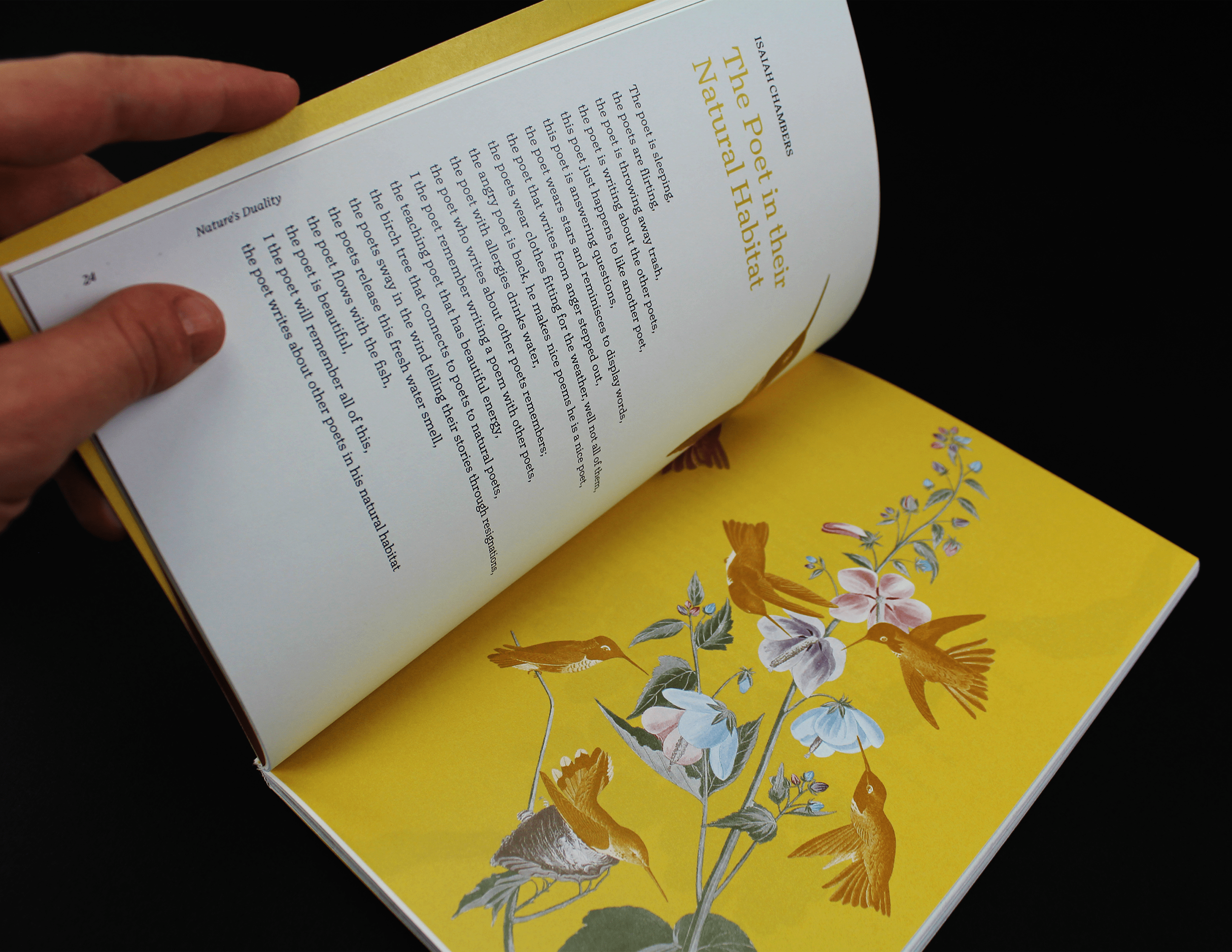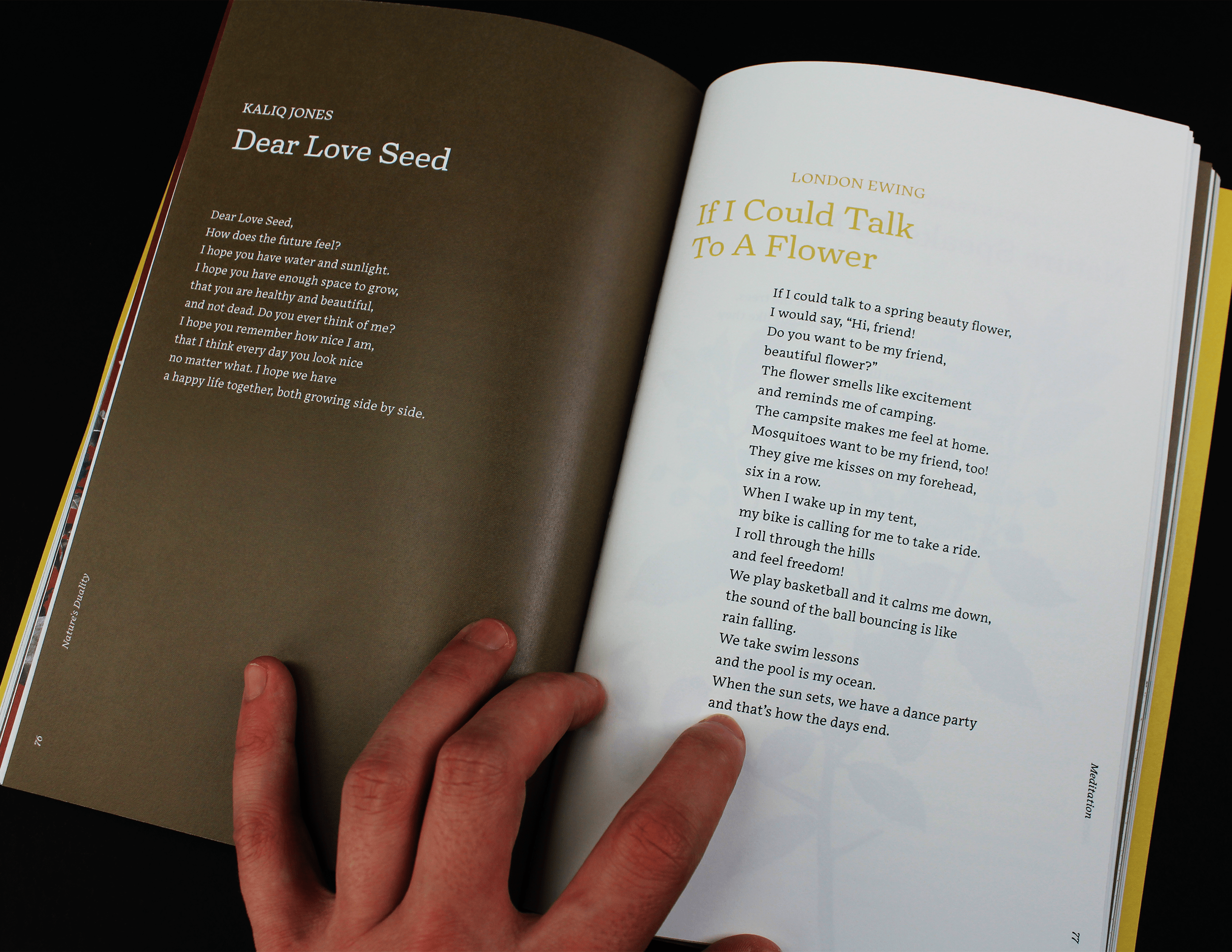 This book was a group-sponsored project working with Inside Out and Mercedes-Benz Financial Services to create a poetry book using students’ poems from K–12. We took inspiration from how nature was used in the poems and broke them up into two main sections. Mediation and Meditation I was responsible for finding and creating the artwork for the books. I would feel free to use illustrations and edit them to be colored in the best way to represent the poem.